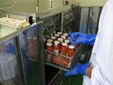 ●容器をノズルに差し込み、水圧洗びん(仕上げ洗い)するリンサー